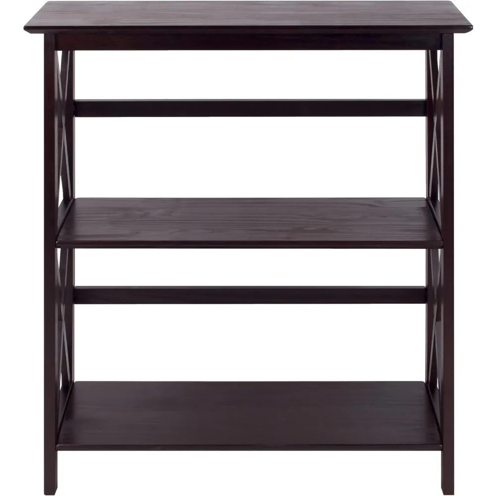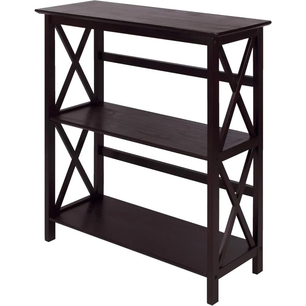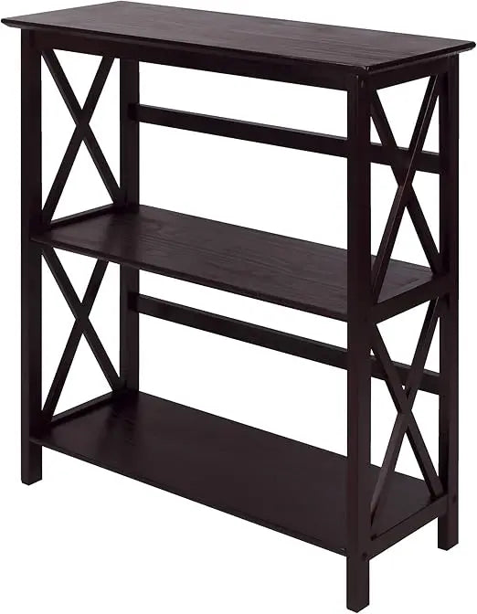 This item features a practical design with three spacious shelves, offering ample storage space for your needs. Its modern x-design style not only provides a sleek and airy aesthetic but also ensures that your books and items stay securely in place. The piece is supported by four sturdy legs that distribute weight evenly, ensuring stability for your belongings. Crafted from solid wood, this item is built to last with increased durability and longevity, and it comes with a simple and light assembly process. Measuring 34 inches in height, 29.50 inches in width, and 11.75 inches in depth, this item weighs approximately 16.75 pounds.