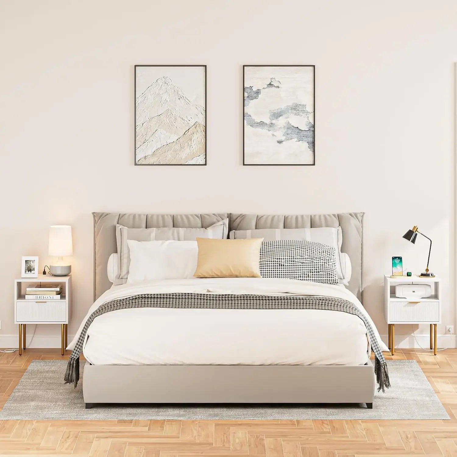 Nightstand,Small Bedside Table with Gold Frame,White Night Stand,Bedside Furniture,Side Table with Drawer and Shelf for Bedroom,Living Room (Modern-Stripe, White-1drawer-Outlet)