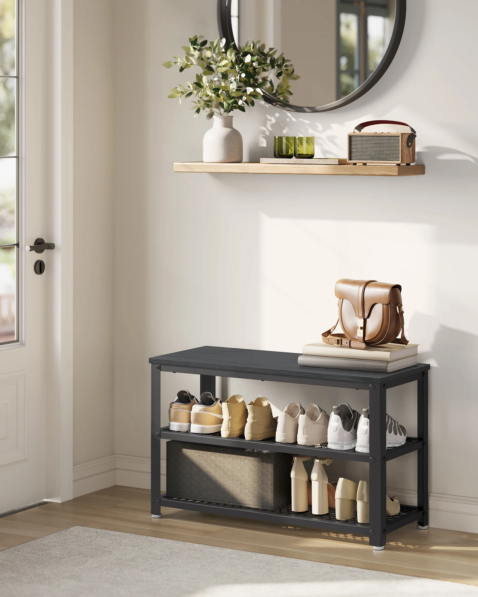 [Roomy Storage] Two metal mesh shelves accommodate 6-8 pairs of shoes and give you a neat entry. The top is perfect for bags and purses at the end of the day