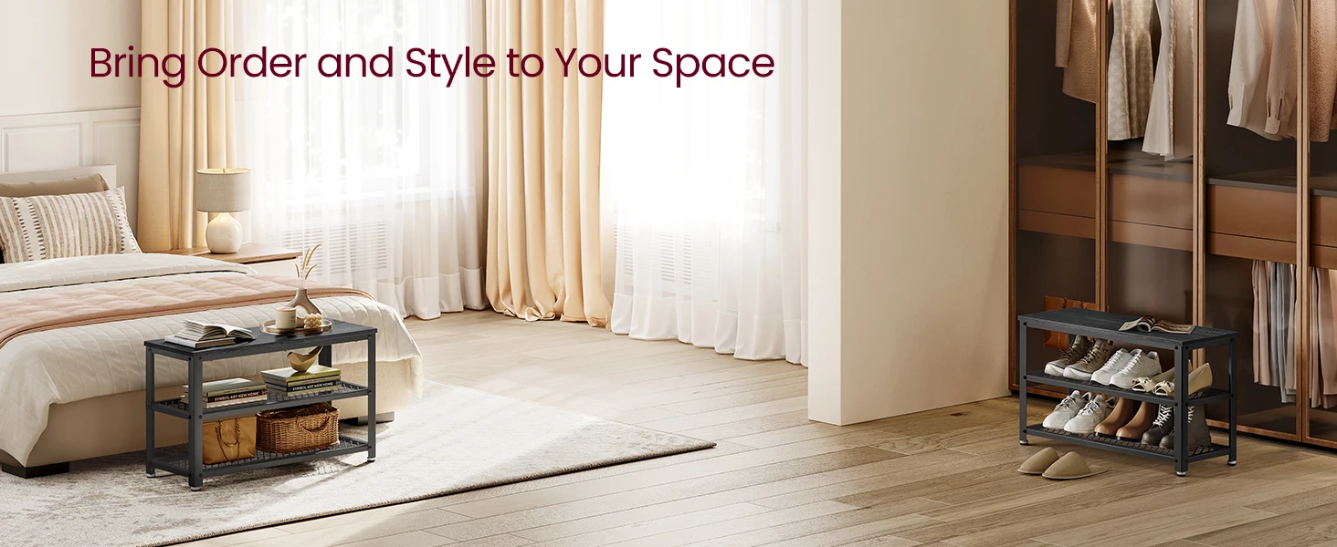 [Detailed Design] This 11.8"D x 28.7"W x 17.7"H shoe bench is made of metal mesh shelves and durable particleboard, weighing only 15 lb