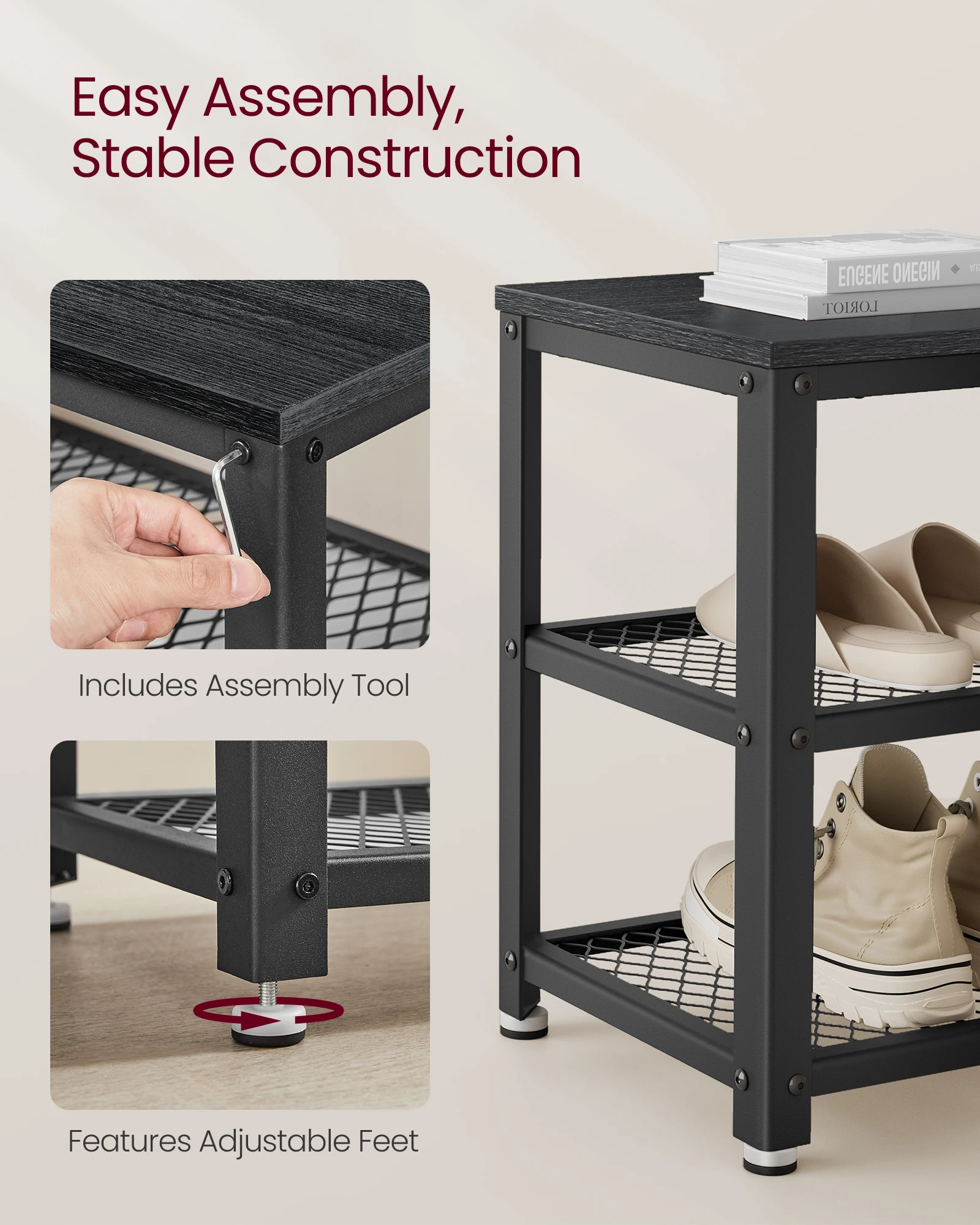 [Industrial Elegance] The ebony black surface of this shoe shelf offers a classic look and the black steel creates an industrial chic style—they now come together on this free standing shoe rack to bring a refined touch to your home